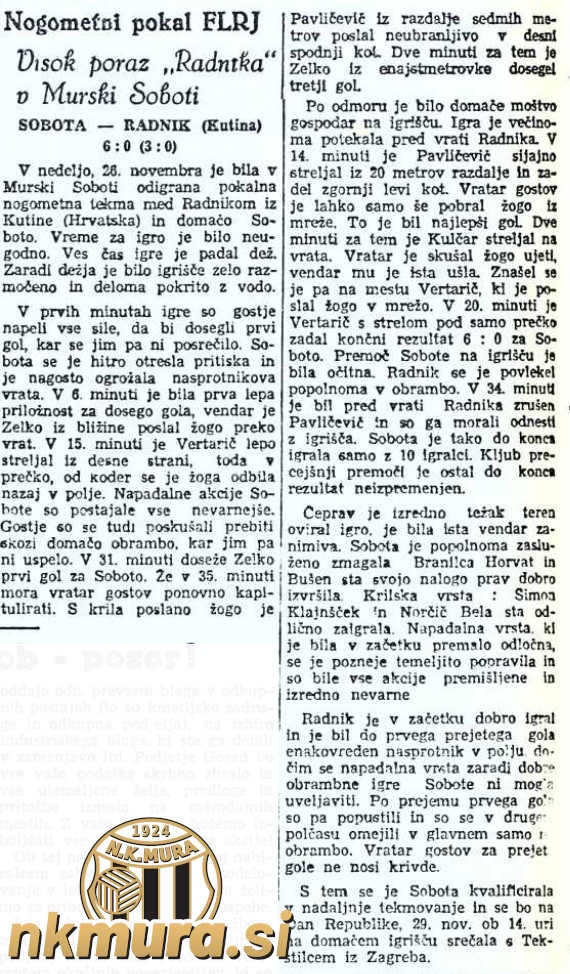 Nogometaši Sobote so v 1/32 finala pokala maršala Tita gostili hrvaški Radnik iz Kutine. V deževnem vremenu so slavili z visokih 6:0 (3:0) in se uvrstili med 32 najboljših ekip v Jugoslaviji.
