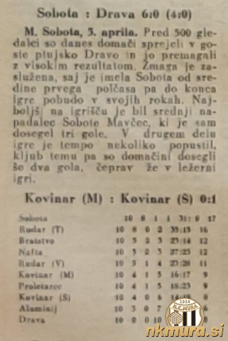Zmaga Sobote je zaslužena, saj so imeli naši nogometaši od sredine prvega polčasa pa do kocan tekme pobudo v svojih rokah. Najboljši mož na igrišču je bil srednji napadalec Feri Maučec, ki je dosegel tri gole. V drugem polčasu je tempo nekoliko upadel, Sobota pa je kljub temu uspela doseči še dva gola.