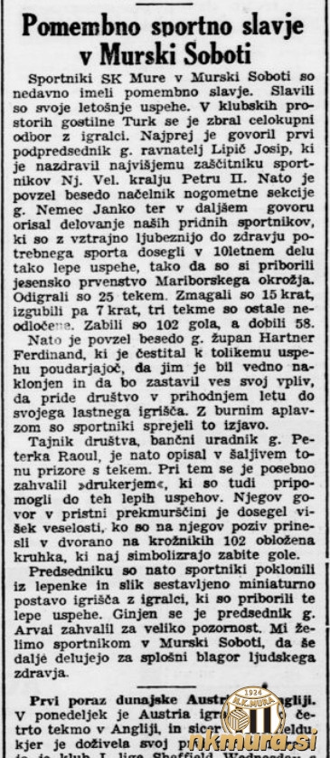 Po končanem jesenskem delu prvenstva in ob koncu leta 1934 je SK Mura v gostilni Turk pripravila klubsko srečanje. Namen srečanja oz. slavja, kot so ga poimenovali, je bila počastitev športnih uspehov, ki jih je klub dosegel v tem koledarskem letu. Zbral se je celotni upravni odbor z igralci.