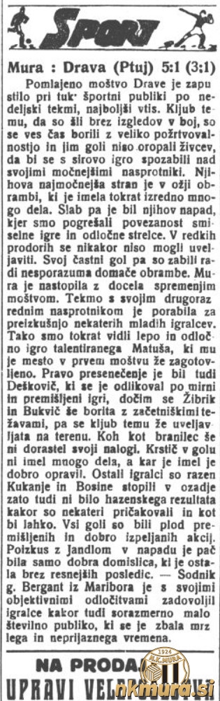 Mura je nastopila v docela spremenjenem in pomlajenem moštvu. V napadu je zaigral mladi Josip Matuš. Pravo presenečenje je bil tudi Ljubomir Deškovič, ki se je odlikoval po mirni in premišljeni igri. Igrala sta tudi Žibrik in Bukvič, ki se še borita z začetniškimi težavami. V obrambi je zaigral tudi Ernest Koch, v golu pa Dušan Krstič. Na sredini je kraljeval Vladimir Kukanja, v napadu pa Jože Bosina. Kot zanimivost naj omenimo, da je vratar Slavko Jandl tokrat igral v napadu.