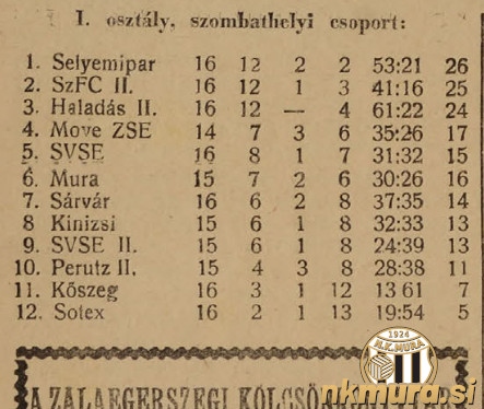 1. Soproni Selyemipar SE 16 12 2 2 53:21 26 2. Szombathelyi II 16 12 1 3 41:16 25 3. Haladas II 16 12 0 4 61:22 24 4. Zalaegerszegi SE 14 7 3 6 35:26 17 5. Celldömölki 16 8 1 7 31:32 15 6. Mura 15 7 2 6 30:26 16 7. Sárvári 16 6 2 8 37:35 14 8. Pápai MÁV 15 6 1 8 32:33 13 9. Soproni VSE II 15 6 1 8 24:39 13 10.Pápai Perutz II 15 4 3 8 28:38 11 11.Kőszegi 16 3 1 12 13:61 7 12.Soproni SoSE 16 2 1 13 19:54 5