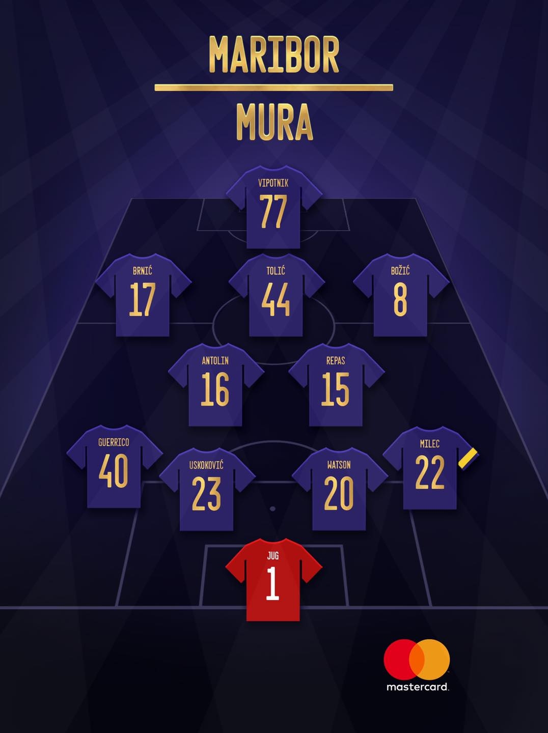 Maribor: Jug, Milec (od 84. Žinič), Watson, Uskoković, Guerrico, Repas, Antolin (od 77. Iličić), Božić (od 66. Kronaveter), Tolić, Brnić (od 66. Sikošek), Vipotnik (od 77. Baturina). Trener: Damir Krznar.
