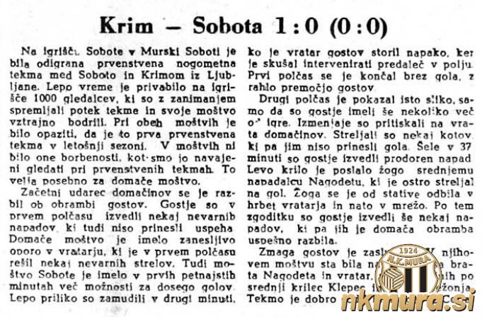 Na igrišču Sobote je bila odigrana tekma 1. kroga slovenske lige med Soboto in Krimom iz Ljubljane. Pred okrog 1000 gledalci so slavili gostje z 0:1, zmagoviti zadetek pa ja padel v drugem polčasu.