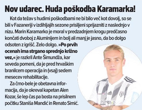Na tekmi med Muro in Aluminijem se je v 41. minuti poškodoval Marin Karamarko. Po zadnjih podatkih ima strgano prednjo križno vez, kar pomeni, da bo z igrišč odsoten vsaj pol leta. To z drugimi besedami pomeni, da je za njega jesenski del sezone 2020/2021 končan.