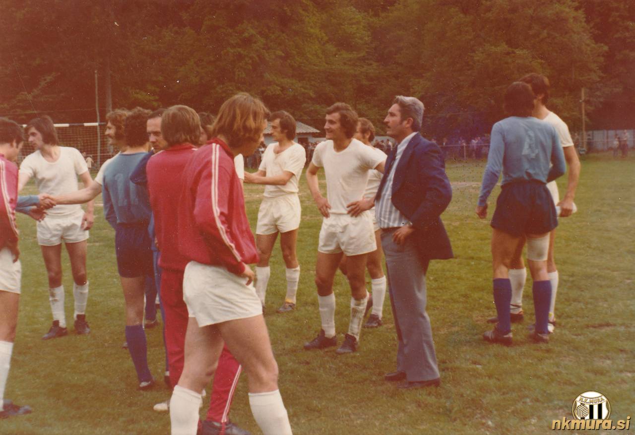 Po eni izmed tekem na Fazaneriji leta 1973. Na sredini je trener Stevo Pozder. Skrajno levo je v belem dresu Drago Posavec. Avtorske pravice: nkmura.si Foto: arhiv Draga Posavca