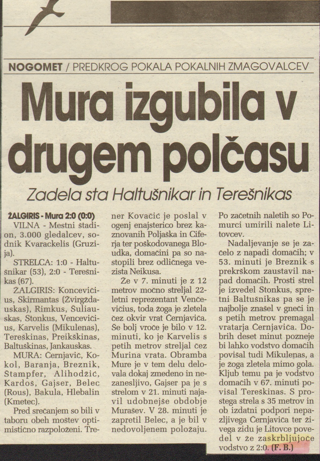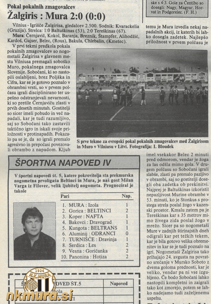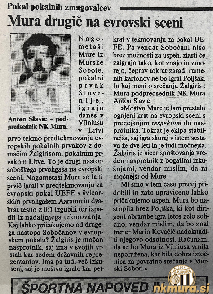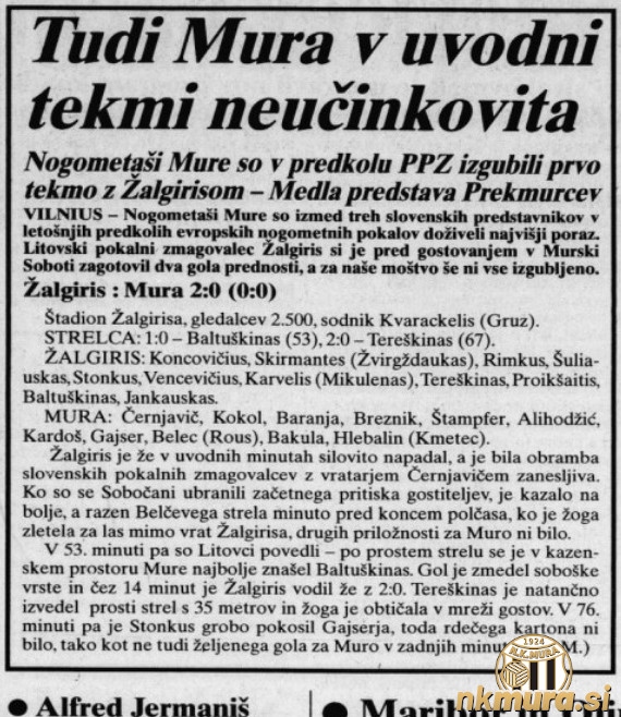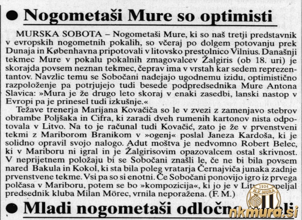 Nogometaši Mure so odigrali prvo tekmo pokala pokalnih zmagovalcev proti Žalgirisu in izgubili z 2:0. Polčas se je končal brez zadetkov. Zmagovalec in potnik v 2. krog kvalifikacij bo znan čez dva tedna na Fazaneriji.