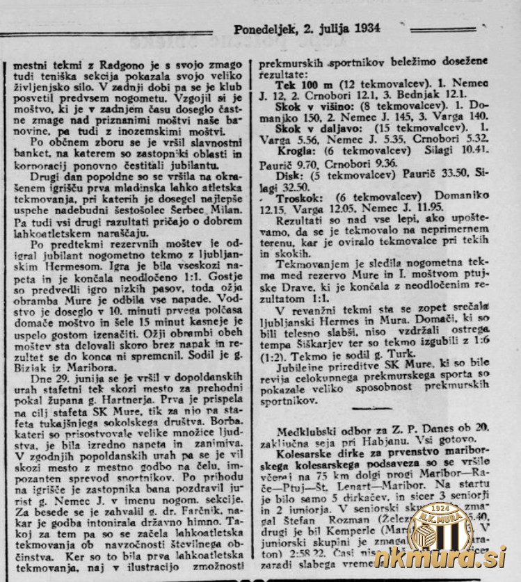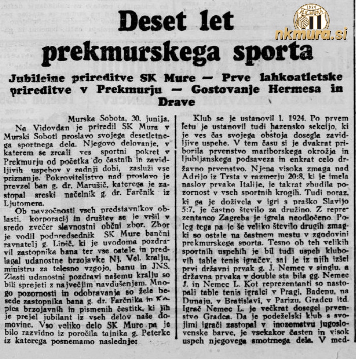V dneh od 27. do 29. junija 1934 je najstarejši prekmurski športni klub, SK Mura, v okviru praznovanja desete obletnice priredil množico dogodkov.