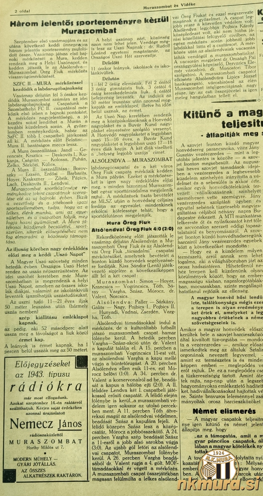 2. moštvo Mure sestavljajo: Borovszky - Miloš Eržen, Erdősi - Barbarič, Ivan Hoyer, Krakszner - Žibrik, Ludvik Papič, Mirko Lah, Dušan Deškovič in Lendvai.