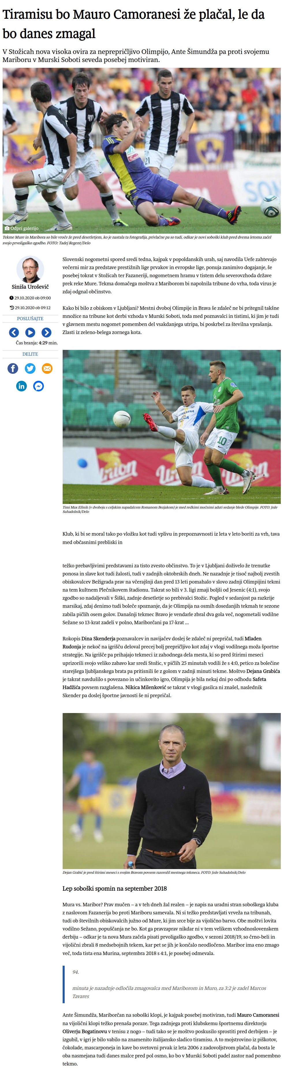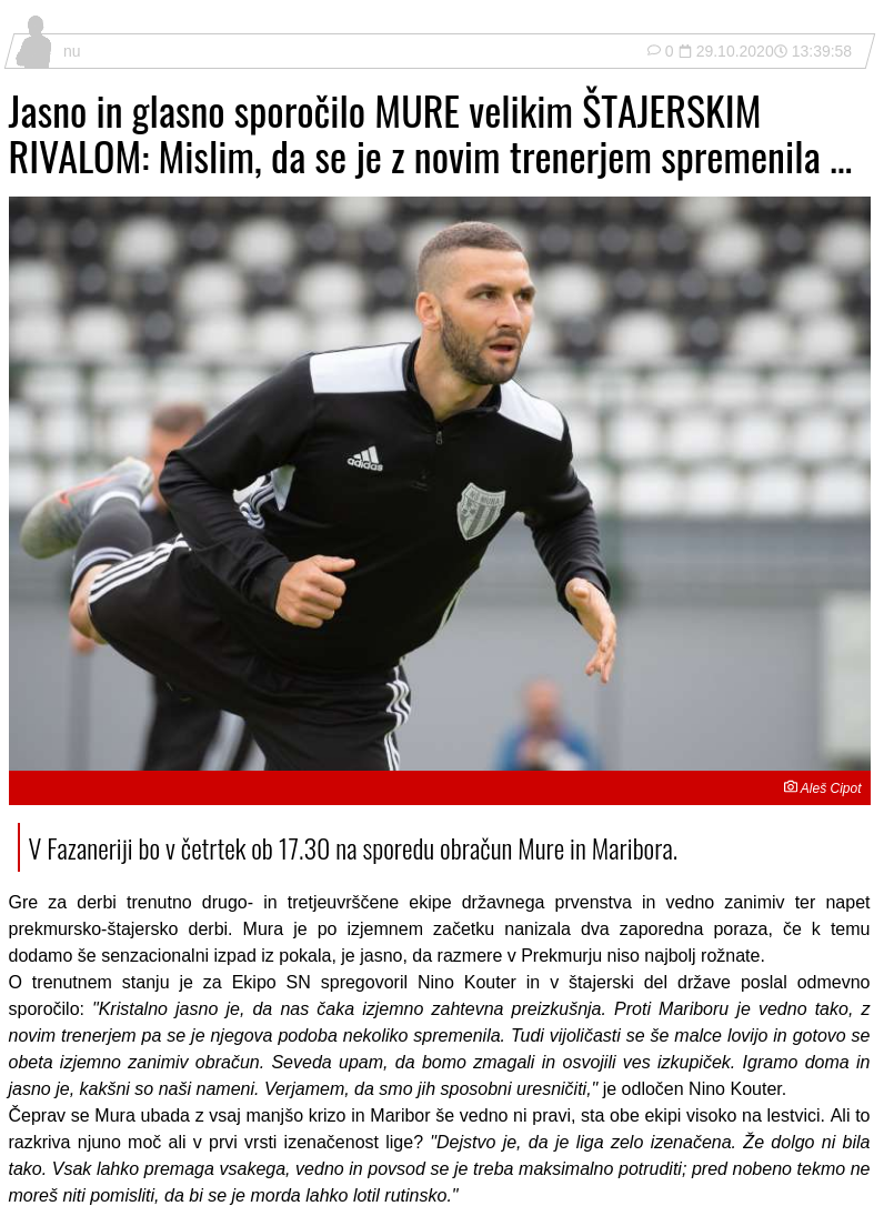 Čeprav so z remijem v Domžalah vodstvo na lestvici prepustili Sežančanom, so bili Prekmurci po koncu nedeljskega obračuna boljše volje od gostiteljev. Že po četrt ure igre so po (sicer pametnem) prekršku Jana Gorenca na igrišču ostali z igralcem manj, dogajanje pa se je v nadaljevanju tako preneslo na črno-belo polovico. Kljub pritisku rumene družine je varovancem Anteja Šimundže uspelo iztržiti veliko točko, predvsem s psihološkega vidika. Soboška morala je v zadnjem času namreč utrpela precej udarcev, nenazadnje so pretekli konec tedna Muraši vpisali sploh prvi pozitiven izid po mesecu dni porazov. Se bodo v četrtek, ko na Fazanerijo prihaja Maribor, naposled vrnili na stara pota?