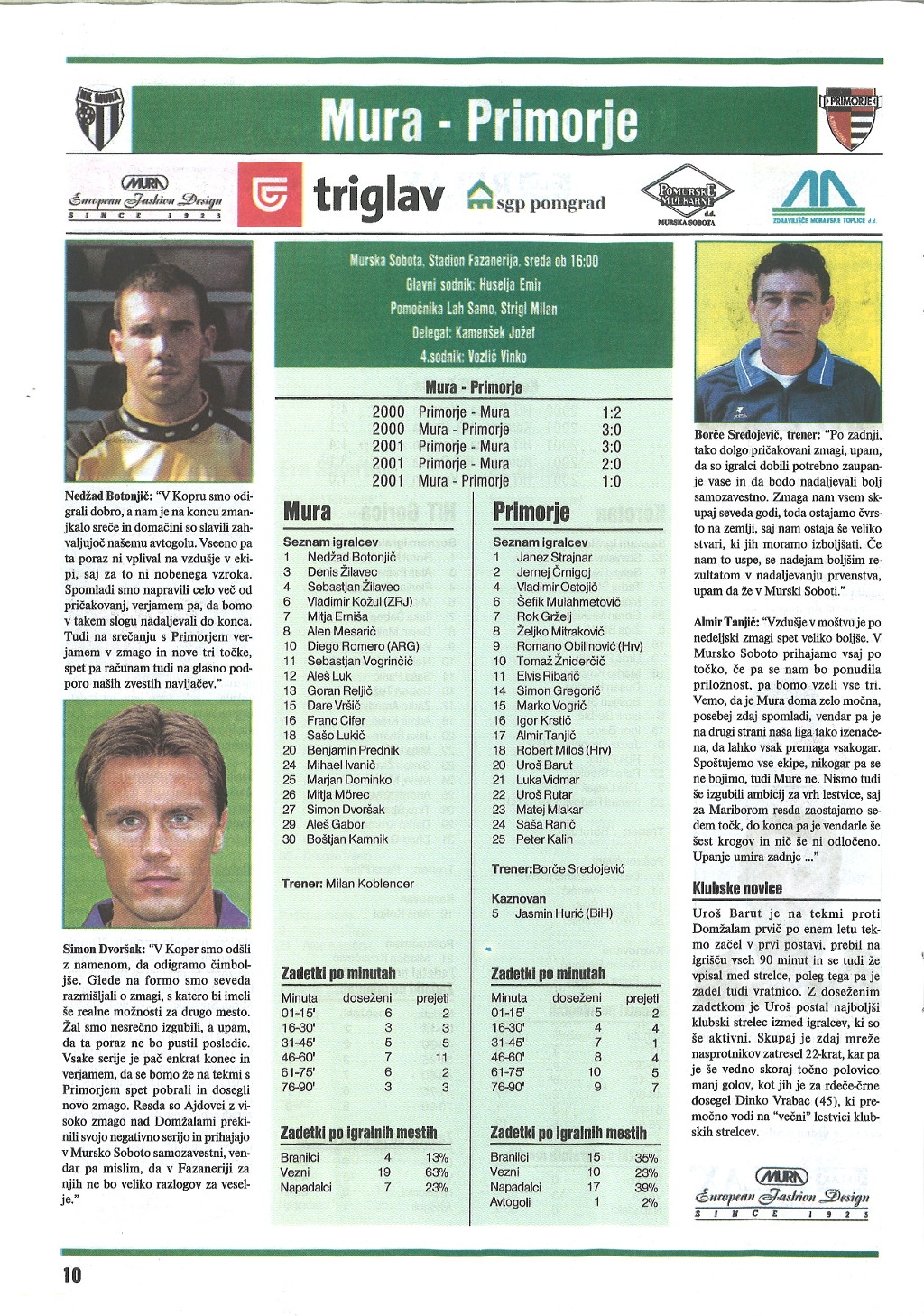 10. aprila 2002 bo na Fazaneriji tekma 28. kroga 1. SNL med Muro in Primorjem. Pred tekmo sta za revijo Derbi iz vrst Mure spregovorila Neđad Botonjič in Simon Dvoršak. Iz vrst Primorja sta izjavo podala trener Borče Sredojević in Almir Tanjič.
