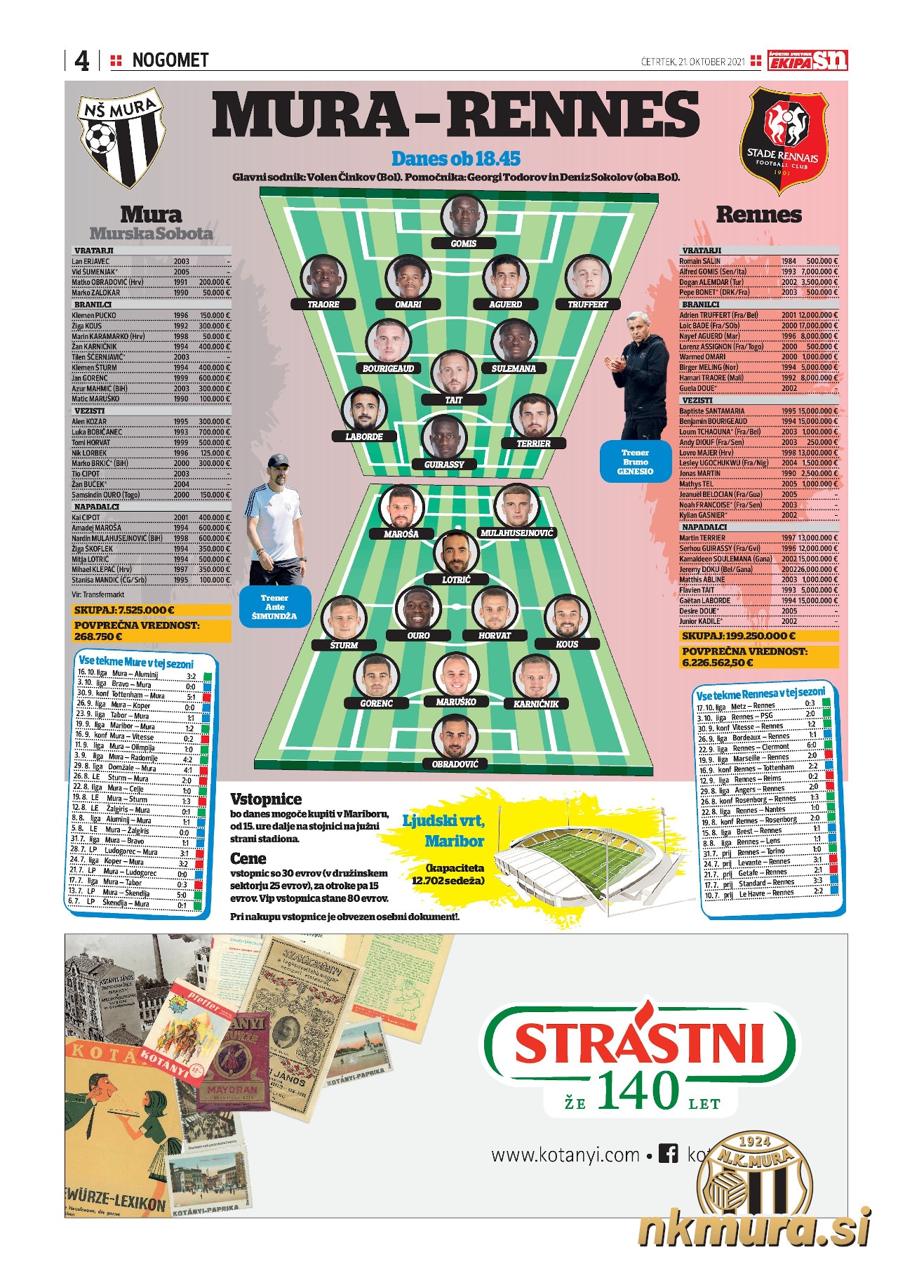 Bruno Génésio, trener Rennesa: "Mura je ekipa, ki večino časa igra s tremi osrednjimi branilci in igra sistem, ki smo ga vajeni iz Ligue 1. Moštvo je ambiciozno, kar so dokazali proti Tottenhamu, čeprav so tam plačali visoko ceno. Gre za ekipo, ki igra svojo igro ne glede na posledice. Igralce sem še posebej opozoril, da ni lahkih in dobljenih tekem, zato se bo za zmago potrebno maksimalno potruditi. Smo favoriti, vendar brez angažiranosti ne bo šlo."