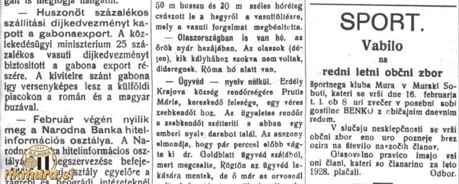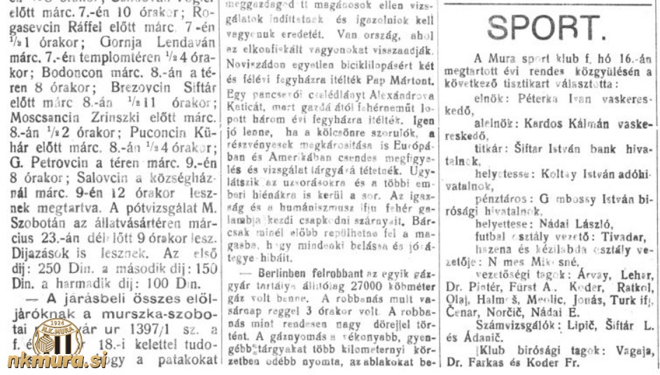 Športni klub Mura je 16. februarja 1929 pripravil redni letni občni zbor. Predsednik kluba je postal Ivan Peterka, ki je zamenjal Vincenca Arvaija. Do spremembe je prišlo tudi na podpredsedniškem mestu. To funkcijo je prevzel Koloman Kardoš.