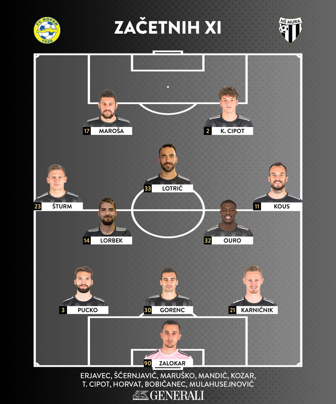 Mura je tekmo igrala v postavitvi 3-4-1-2 in je za razliko od prejšnjih tekem pričela z dvema napadalcema, Amadejem Marošo in Kaijem Cipotom. V začetni enajsterici je prišlo do petih sprememb. Na mestu branilca Karamarka je zaigral Pucko. Na sredini je pred Kozarjem priložnost dobil Ouro, nova pa je bila napadalna trojka, ki jo je sestavljal še Lotrič. Koper se je predstavil v svoji značilni postavitvi s štirimi branilci.