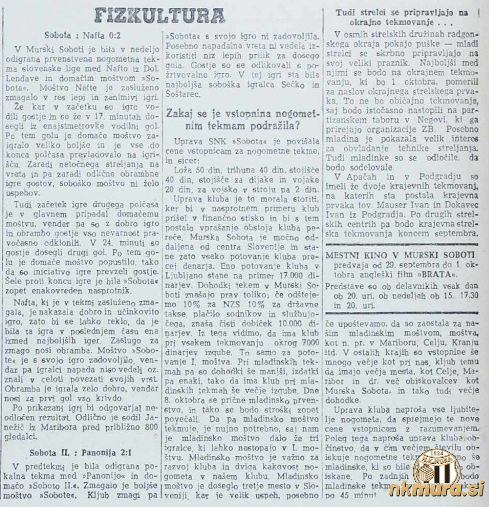 V predtekmi sta se za pokal FLRJ (pokal maršala Tita) pomerila druga ekipa Sobote in Panonija. Zmagala je Sobota z 2:1. Najboljša soboška igralca sta bila Sečko in Šoštarec.