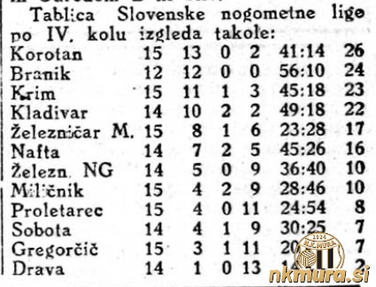 1. Korotan 15 13 0 2 41:14 26 2. Branik 12 12 0 0 56:10 24 3. Krim 15 11 1 3 45:18 23 4. Kladivar 14 10 2 2 49:18 22 5. Železničar MB 15 8 1 6 23:28 17 6. Nafta 14 7 2 5 45:26 16 7. Železničar NG 14 5 0 9 36:40 10 8. Miličnik 15 4 2 9 28:46 10 9. Proletarec 15 4 0 11 24:54 8 10.Sobota 14 4 1 9 30:25 7 11.Gregorčič 15 3 1 11 20:59 7 12.Drava 14 1 0 13 14:74 2
