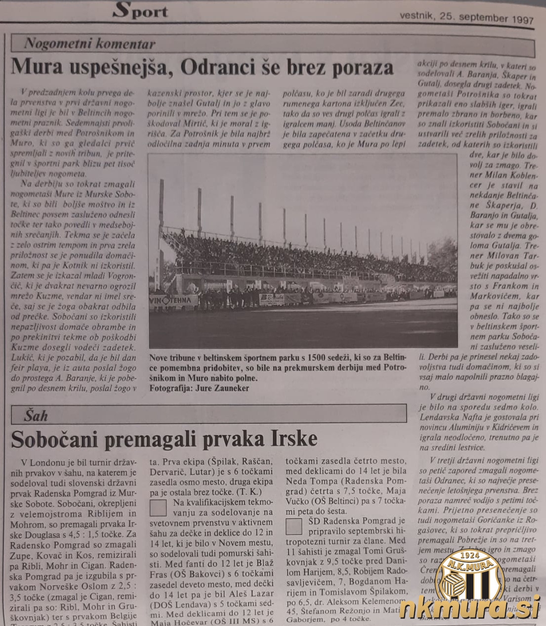 Nogometaši Mure so se v 8. krogu prvenstva v sezoni 1997/98 v Beltincih pomerili s Potrošnikom in zmagali z 0:2 (0:1). Tradicionalni prekmurski derbi si je ogledalo okrog 4500 gledalcev, prvič tudi z nove tribune.
