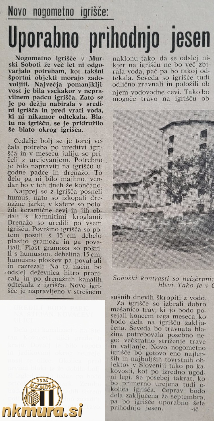 Sanacija igrišča se je pričela julija 1964, klubu pa so na pomoč priskočili občinska skupščina in drugi merodajni faktorji v Murski Soboti. Najprej so z igrišča sneli humus in nato izkopali drenažne jarke, v katere so položili keramične cevi in jih obdali s kamniti kroglami (frakcijo). Drenažo so uredili po vsem igrišču in sicer po celotni dolžini ter nato še diagonalno. Površino igrišča so posuli s 15 cm debelo plastjo gramoza in ga povaljali. Gramozu je sledilo 15 cm humusa. Novo igrišče je narejeno v strešnem naklonu, tako da se na njem ne bo več zbirala voda. Ob igrišču so položili še vodovodne cevi, ki bodo služile namakanju. Za igrišče so izbrali dobro mešanico trav, ki jo bodo posejali konec septembra 1964, Čeprav bodo dela zaključena že septembra bo igrišče uporabno šele prihodnje leto, torej leta 1965. Vodja gradbenih del je Ludvik Cigut.