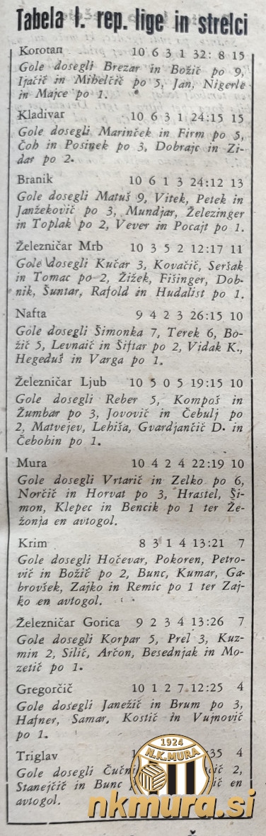 1. Korotan 10 6 3 1 32:8 15 2. Kladivar 10 6 3 1 24:15 15 3. Branik 10 6 1 3 24:12 13 4. Železničar MB 10 3 5 2 12:17 11 5. Nafta 9 4 2 3 26:15 10 6. Železničar LJ 10 5 0 5 19:15 10 7. Mura 10 4 2 4 22:19 10 8. Krim 8 3 1 4 13:21 7 9. Železničar GO 9 2 3 4 13:26 7 10.Gregorčič 10 1 2 7 12:25 4 11.Triglav 10 1 2 7 8:35 4