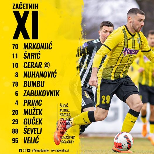 Radomlje: Šugić, Ševelj, Guček, Mužek, Primc (od 71. Rugašević), Zabukovnik, Bumbu (od 61. Ćalušić), Nuhanović (od 71. Jazbec), Cerar (od 61. Prohouly), Šarić (od 77. Čuić), Mrkonjić. Trener: Nermin Bašić.
