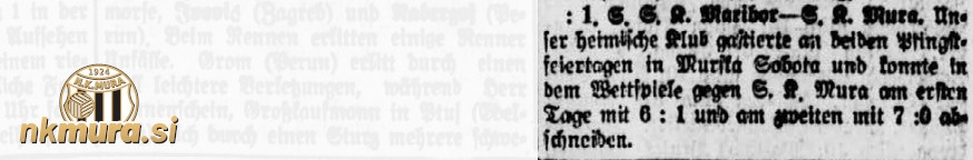 Mura je igrala dve tekmi z I.SSK Maribor in obe izgubila. Avtorske pravice: nkmura.si Foto: Marburger Zeitung, 3. junij 1925