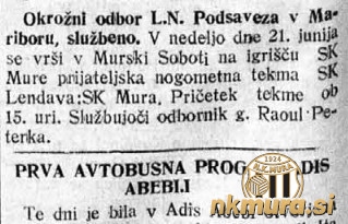 V Murski Soboti je bila 21. junija 1936 prijateljska tekma med Muro in Lendavo. Uspeli smo zaslediti le to, da je Mura tekmo izgubila z enim zadetkom razlike. Točnega rezultata žal nismo uspeli najti. Tekma je bila odigrana na novem stadionu v Murski Soboti.