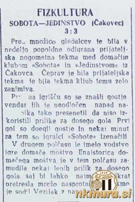 Nogometaši Sobote so premor med spomladanskim in jesenskim delom sezone 1950 izkoristili za prijateljsko tekmo z Jedinstvom iz Čakovca. Pred velikim številom gledalcev je bil rezultat neodločen 3:3.