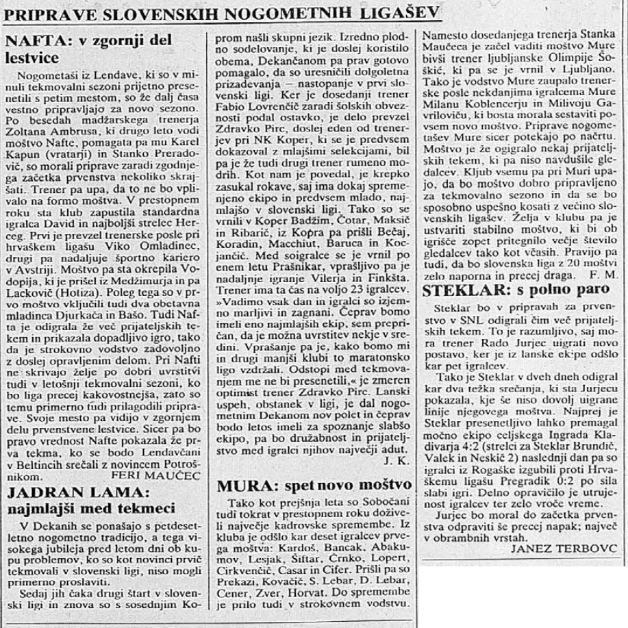 Nogometaši Mure se že nekaj časa pripravljajo na prvo prvenstvo samostojne Slovenije 1991/1992. Glede na preteklo sezono je klub zapustilo deset igralcev: Kardoš, Bencak, Abakumov, Lesjak, Šiftar, Črnko, Lopert, Cirkvenčič, Casar in Cifer. Ekipo so okrepili Emil Prekazi, Robert Kovačič, Slavko Lebar, Danijel Lebar, Smiljan Cener, Kristjan Zver in Horvat.
