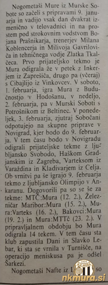V prvem prvoligaškem državnem prvenstvu samostojne Slovenije sodeluje 21 ekip. Vse ekipe, tudi Mura so pričele s pripravami na nadaljevanje prvenstva, ki se začne 1. marca 1992, ko bo Mura na Fazaneriji gostila Steklar iz Rogaške Slatine.