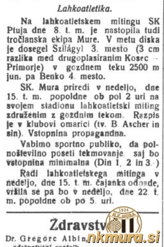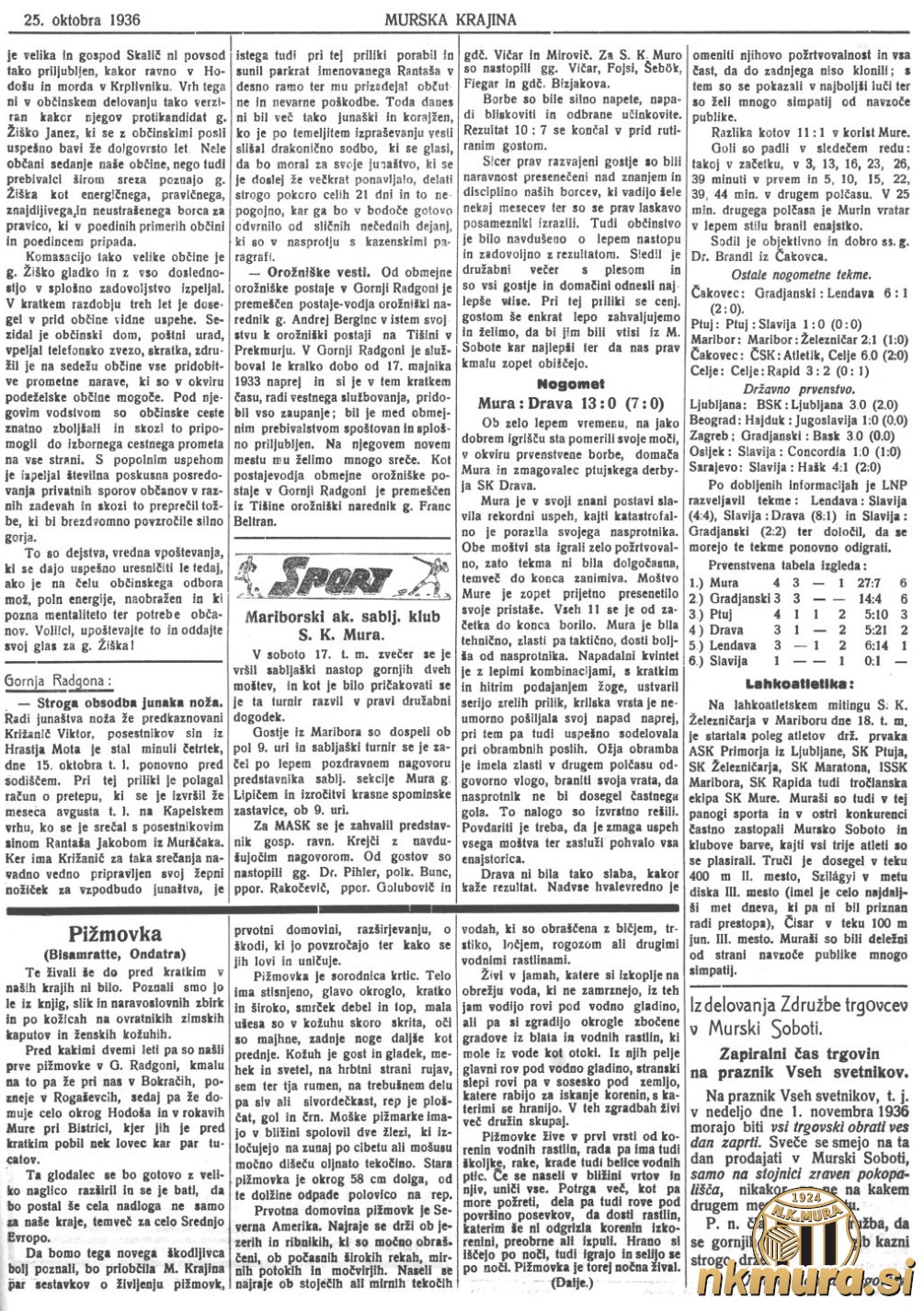 Mura pred novo smučarsko sezono pripravlja gimnastiko. Gimnastične vaje se bodo pričele 11. novembra 1936 ob 20.00 v dvorani stare kavarne. Gimnastični večeri bodo potekali dvakrat tedensko in sicer v sredo ter petek. Tečaj vodi znani pionir smučarskega športa v Prekmurju odvetnik Koder.