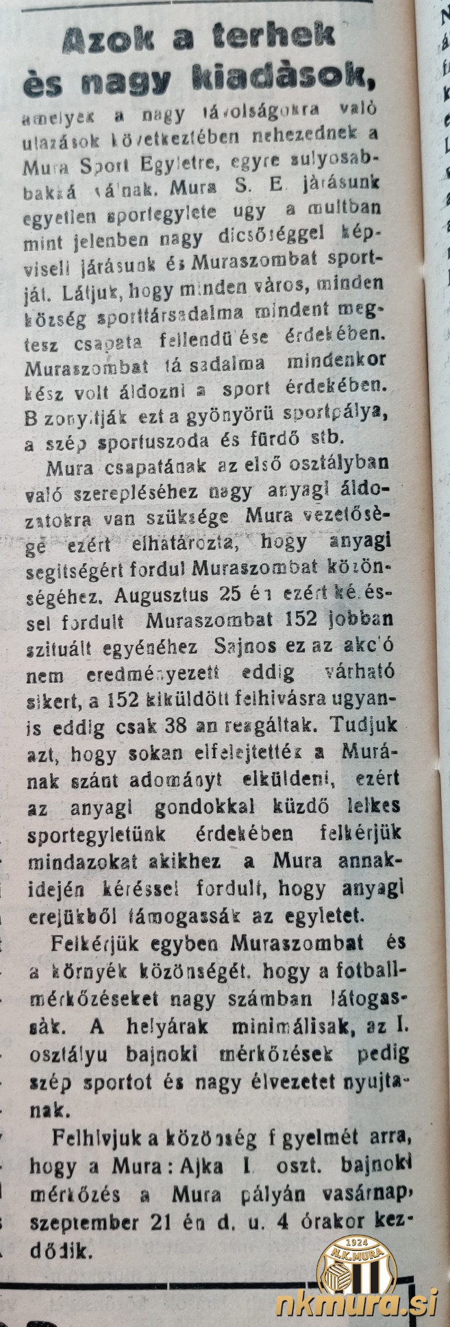 Vodstvo Mura se je odločilo in za donacije prosilo prebivalce Murske Sobote. 25 avgusta 1941 se je klub obrnil na 152 posameznikov, vendar se je prošnji odzvalo le 38 ljudi. Klub se spopada z vse večjimi finančnimi težavami, zato se še enkrat obrača na posameznike, da darujejo po svoji moči.