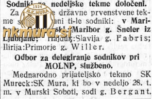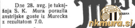 Mura je 28. avgusta 1932 igrala prvo mednarodno tekmo v svoji zgodovini. V Murski Soboti je bil njen nasprotnik avstrijski Mureck. Črno-beli so zmagali s 7:0.