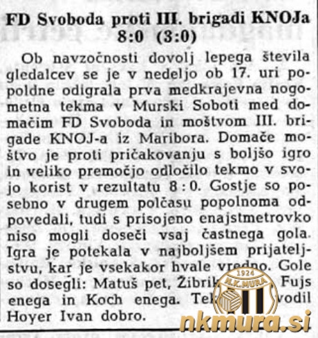 V Murski Soboti je bila odigrana prva tekma Mure po 2. svetovni vojni. Sobočani, ki so igrali pod imenom Svoboda so gostili III. brigado KNOJa iz Maribora. Zmagala je Svoboda z 8:0 (3:0).