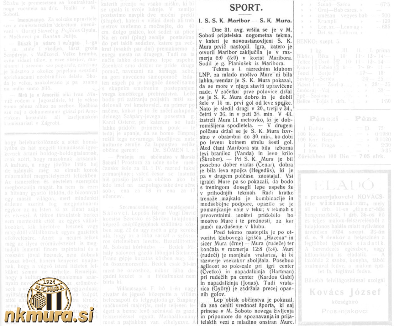 Poročilo s prve tekme Mure, ki je bila 31. avgusta 1924. Avtorske pravice: nkmura.si Foto: Mörszka krajina, št. 36, 7. september 1924