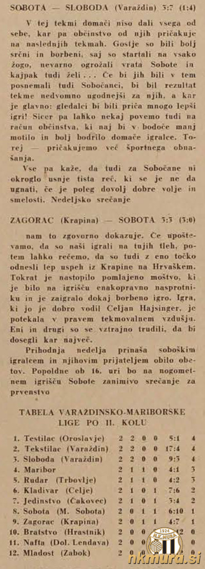 1. Tekstilac Oroslavje 2 2 0 0 5:1 4 2. Tekstilac Varaždin 2 2 0 0 17:4 4 3. Sloboda Varaždin 2 2 0 0 9:3 4 4. Maribor 2 1 1 0 4:1 3 5. Rudar Trbovlje 2 1 1 0 4:2 3 6. Kladivar Celje 2 1 0 1 7:6 2 7. Jedinstvo Čakovec 2 1 0 1 3:4 2 8. Sobota 2 0 1 1 6:10 1 9. Zagorec Krapina 2 0 1 1 4:7 1 10.Bratstvo Hrastnik 2 0 0 2 6:12 0 11.Nafta 2 0 0 2 1:5 0 12.Mladost Zabok 2 0 0 2 1:12 0