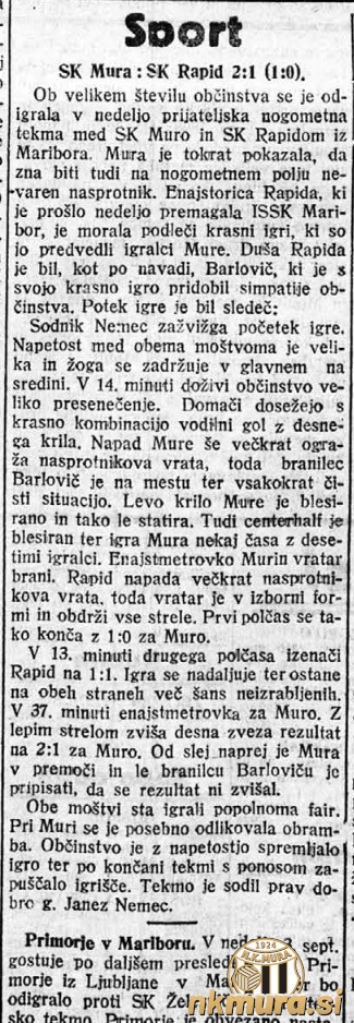 Nogometaši Mure so v nedeljski prijateljski tekmi z 2:1 premagali mariborski Rapid. To je bila prva zmaga Mure nad tem mariborskim klubom.