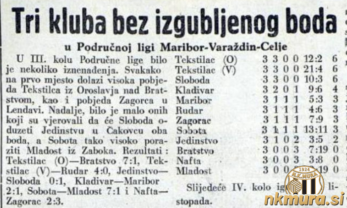 1. Tekstilac (O) 3 3 0 0 12:2 6 2. Tekstilac (VŽ) 3 3 0 0 21:4 6 3. Sloboda 3 3 0 0 10:3 6 4. Kladivar 3 2 0 1 9:6 4 5. Maribor 3 1 1 1 5:3 3 6. Rudar (T) 3 1 1 1 4:6 3 7. Zagorec 3 1 1 1 7:9 3 8. Sobota 3 1 1 1 13:11 3 9. Jedinstvo 3 1 0 2 3:5 2 10.Bratstvo 3 0 0 3 7:19 0 11.Nafta 3 0 0 3 3:8 0 12.Mladost 3 0 0 3 2:19 0