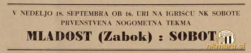 Nogometaši Sobote so po porazu in neodločenem izidu tokrat v mariborsko - varaždinsko - celjski ligi dosegli prvo zmago. V Murski Soboti so gostovali igralci Mladosti iz Zaboka, Sobočani pa so zmagali s kar 7:1 (2:1).
