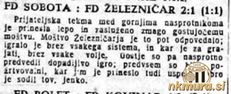 Nogometaši Sobote so prvenstveni premor izkoristili za prijateljsko tekmo z mariborskim Železničarjem. Sobočani so se iz Maribora vrnili z zmago z 1:2 (1:1).