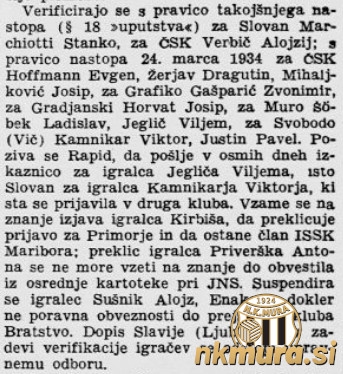 Sport klub Mura sta okrepila Ladislav Šöbek in Viljem Jeglič. Pravico nastopa imata od 24. marca 1934.
