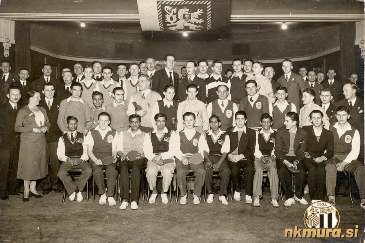 Svetovno prvenstvo v namiznem tenisu v Pragi (1932). Drugi z leve sedi član SK Mure Janez Nemec. Avtorske pravice: nkmura.si Foto: Sketch