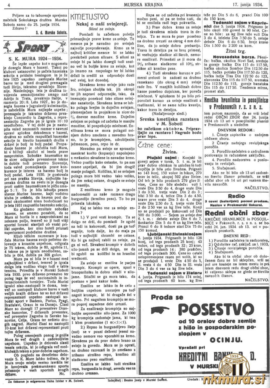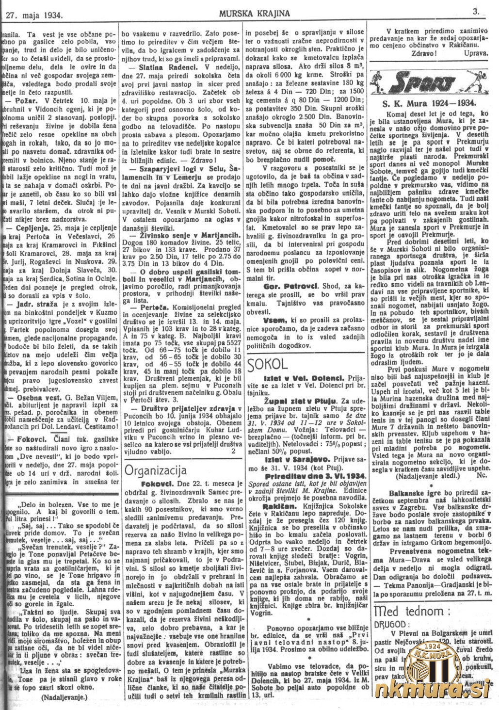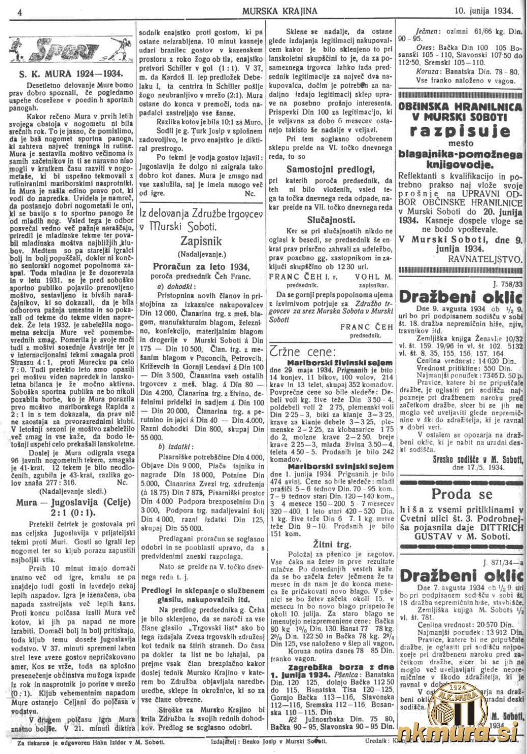 Leto 1934 je leto Mure, saj Sport klub Mura praznuje deseto obletnico delovanja. Če je bil leta 1924 šport v domeni Murske Sobote in Mure, lahko leta 1934 ugotavljamo, da se je šport, prav zaradi našega kluba, zaril v vse pore življenja ob reki Muri. Deset let pozneje lahko na pašnikih in travnikih srečujemo kmečke fante kako nabijajo žogo.
