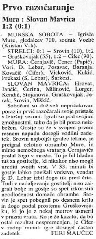 Nogometaši Mure so po seriji dobrih tekem, tokrat prvič razočarali svoje gledalce. Na Fazaneriji so doživeli poraz proti Slovanu z 1:2. Gostje so vodili že 0:2, častni zadetek za Muro pa je v 89. minuti dosegel Franc Cifer.