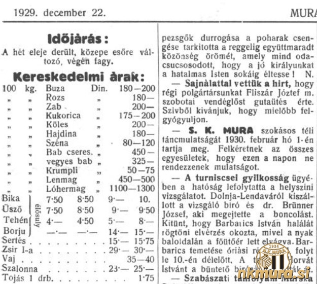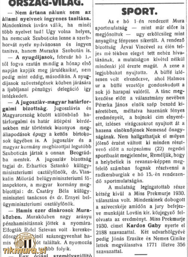 Športni klub Mura je 1. februarja 1930 priredil tradicionalno pustno zabavo. Za dobro razpoloženje je skrbela vrhunska ciganska glasba in izvirna jazz skupina. V sklopu plesnega večera je bil letos prvič organiziran izbor Miss Prekmurje.