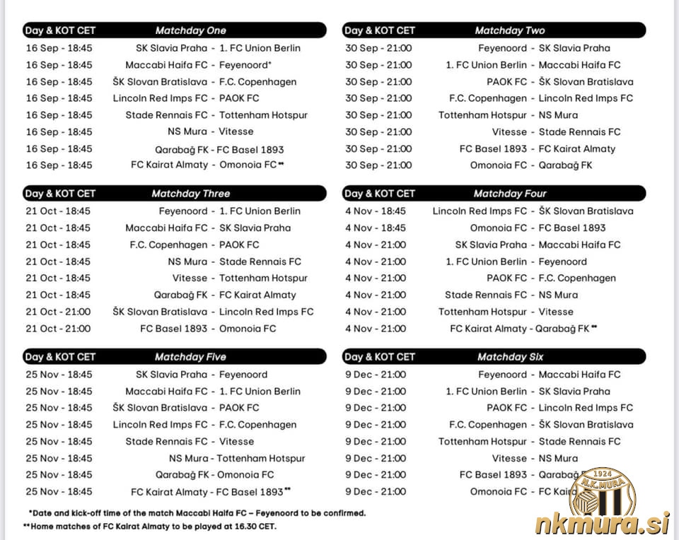 Razpored tekem v Evropski konferenčni ligi za sezono 2021/22. Mura bo vse domače tekme igrala ob 18.45. Avtorske pravice: nkmura.si Foto: facebook NŠ Mura, 28. avgust 2021