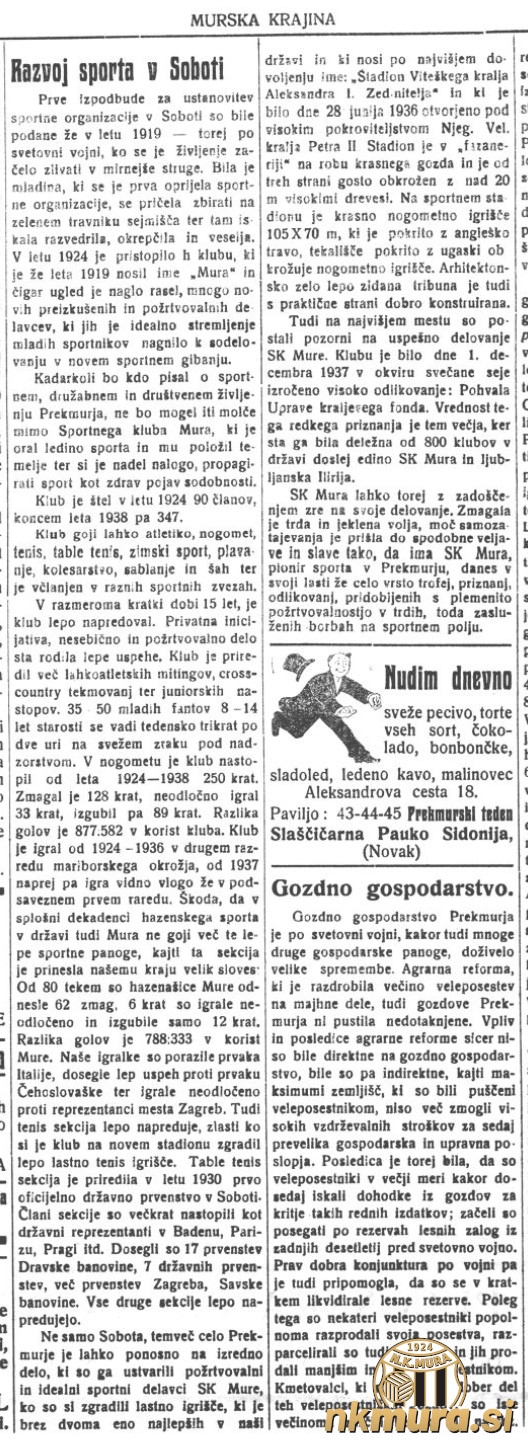 SK Mura je predstavljala temelj športnega udejstvovanja v pokrajini ob Muri. Klub je oral ledino na mnogih področjih, od nogometa, hazene, plavanja, tenisa, table tenisa, atletike itd. Leta 1924 je klub štel 90 članov, ob koncu leta 1938 pa 347. V razmeroma kratki dobi, tj. petnajstih letih, je klub lepo napredoval, imel je podporo soboškega župana Ferdinanda Hartnerja in trgovcev, ki so s svojimi sredstvi podpirali klub.