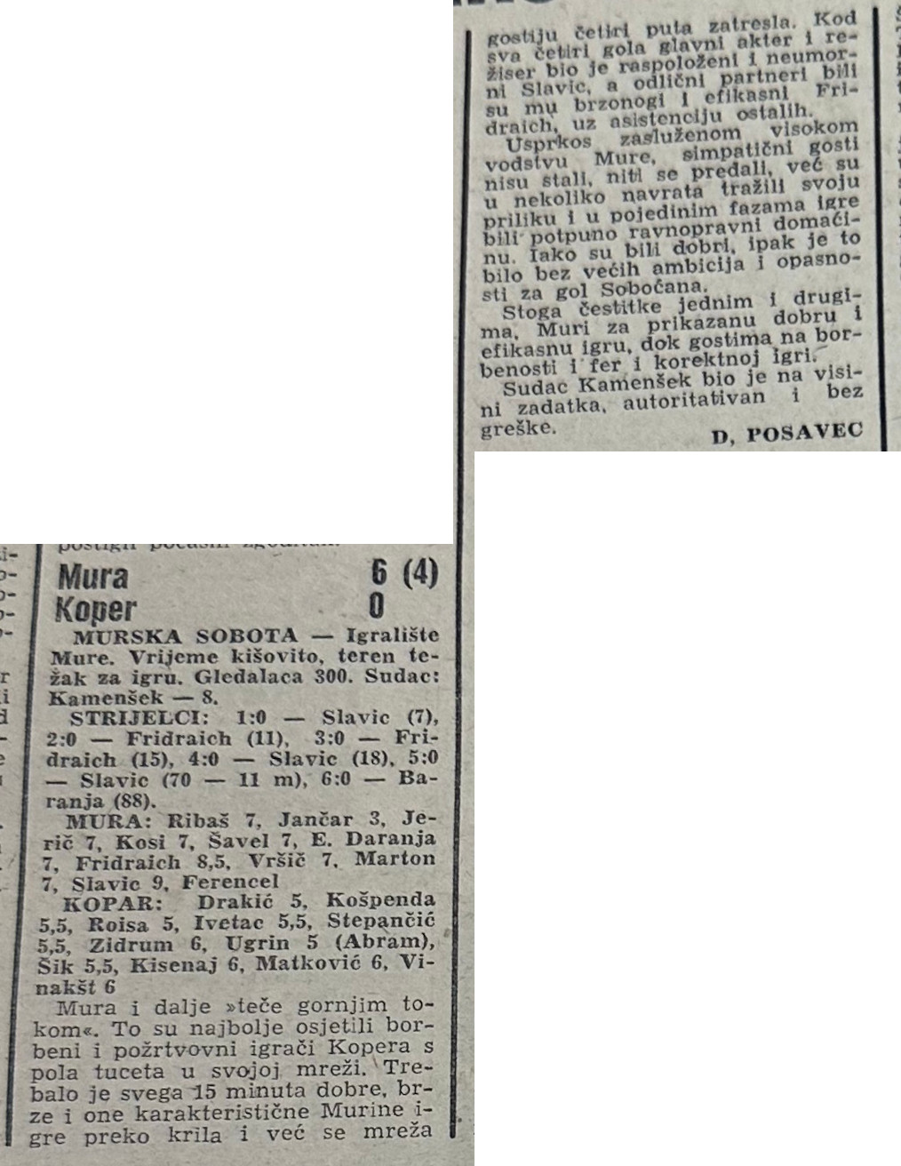 6 - Najvišji prvenstveni izid med tema tekmecema je bil 6:0 v korist Mure. Dosežen je bil 12. oktobra 1980 na tekmi SNL na Fazaneriji. V deževnem vremenu in pred 300 gledalci so za Muro zadeli Slavic (3), Fridraich (2) in Baranja.