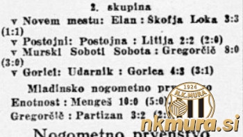 1. Sobota 13 11 0 2 59:24 22 2. Udarnik Kranj 13 11 0 2 55:29 22 3. Jože Gregorčič 12 7 0 5 41:36 14 4. Gorica 12 6 1 5 33:25 13 5. Litija 12 4 1 7 26:38 9 6. Škofja Loka 12 4 1 7 30:45 9 7. Postojna 13 2 3 8 33:42 7 8. Elan 13 1 2 10 16:54 4