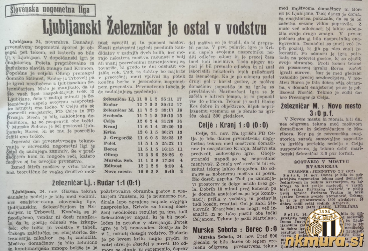 1. Železničar LJ 11 8 1 2 35:11 17 2. Rudar 12 7 3 2 30:12 17 3. Železničar MB 11 7 2 2 39:17 16 4. Svoboda 11 7 1 3 29:15 15 5. Celje 12 6 2 4 31:26 14 6. Kranj 11 6 1 4 29:20 13 7. Krim 12 6 1 5 36:27 13 8. Jože Gregorčič 11 6 0 5 25:23 12 9. Polet 11 5 1 5 25:22 11 10.Borec 11 5 1 5 16:15 11 11.Olimp 12 3 3 6 28:26 9 12.Murska Sobota 11 1 2 8 17:33 4 13.Edinost 12 1 2 9 8:59 4 14.Novo mesto 10 0 2 8 9:49 2