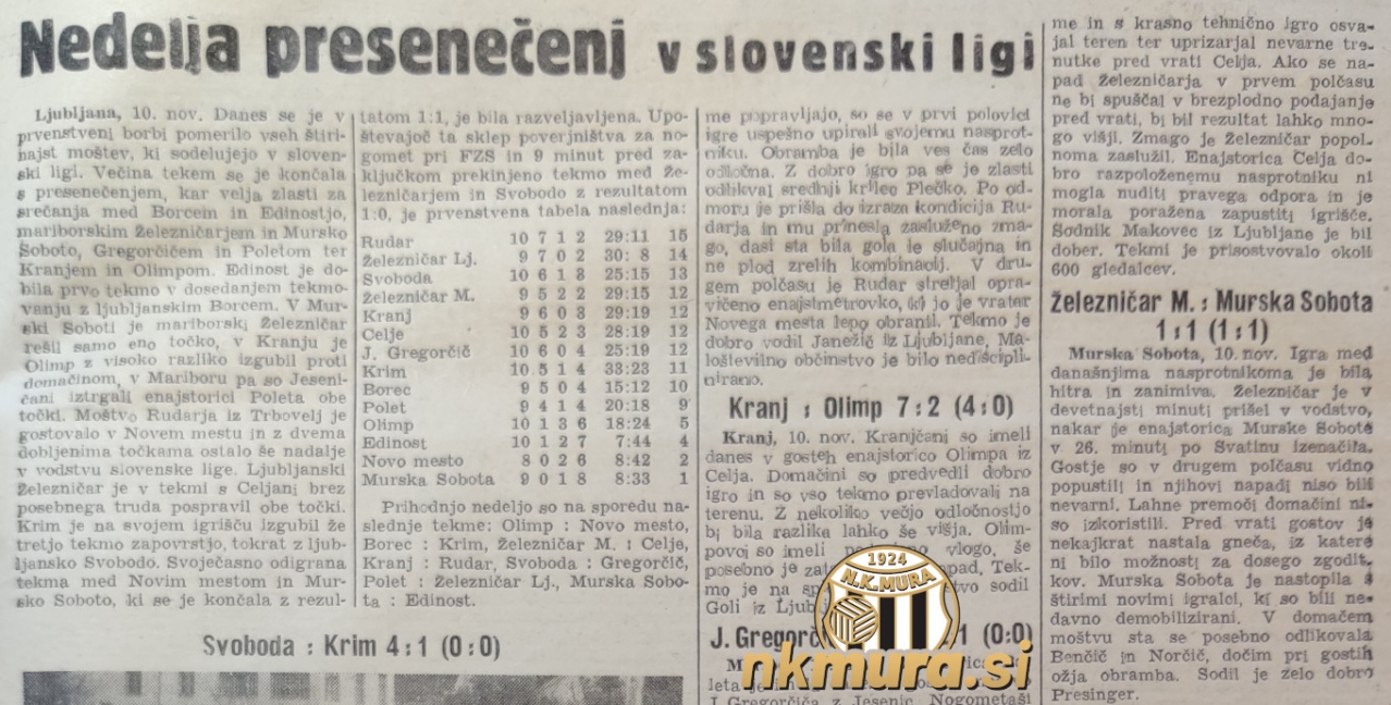 Igra med soboškim in mariborskim klubom je bila hitra in zanimiva. Železničar je v vodstvo prišel v 19. minuti, nakar je enajsterica Murske Sobote v 26. minuti izid izenačila. Uspešen je bil Slavko Svatina. Gostje so v drugem polčasu vidno popustili in njihovi napadi niso bili več nevarni. Sobota tega ni znala izkoristiti in tako je ostalo 1:1.