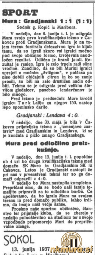 V nedeljo, 6. junija 1937 je Mura igrala prvo dodatno tekmo z Građanskim za naslov prvaka II. razreda mariborske skupine. Končni rezultat 1:1 je bil dosežen že v prvem polčasu.